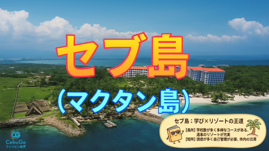 セブ島(特にマクタン島)が最適です。世界的なリゾートホテルがあり、週末にダイビングやアイランドホッピングを楽しみつつ、平日は学校で学ぶスタイルが確立されています 。