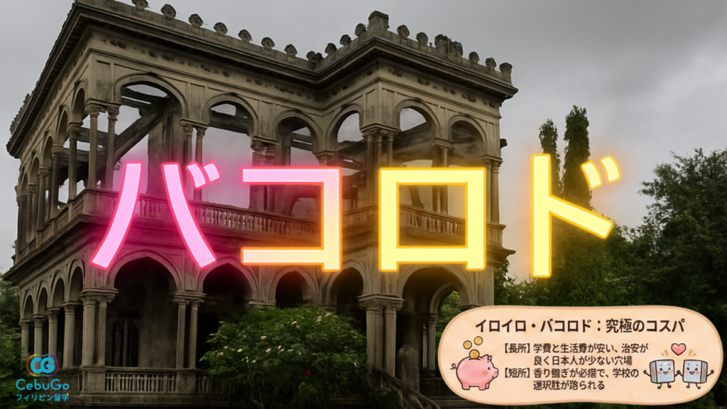 イロイロとバコロドです。大都市マニラやセブに比べて生活費や学費が安く、コストパフォーマンスに非常に優れています 。「💡あわせて読みたい: 実際の生活費や節約のコツを知りたい方は、『セブ島留学1ヶ月でかかる費用は?リアルな内訳と節約術を徹底解説!』を参考に予算のイメージを掴んでみてください。」