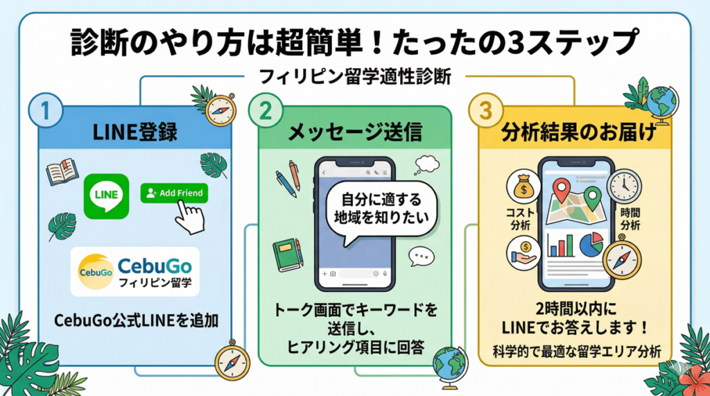 「せっかく留学したのに、環境が合わなくてストレスばかりだった…」という失敗を防ぐために、ぜひお気軽にCebuGo公式LINEからメッセージを送ってくださいね!
