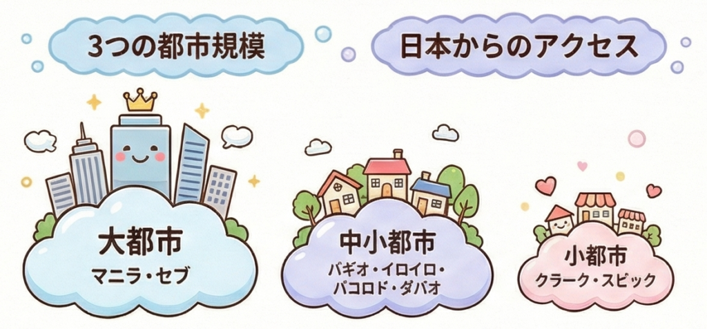 フィリピンの語学留学先は、主に7〜8つの主要な都市・エリアに区別されており、それぞれ気候や治安、学習環境に明確な違いがあります。また、都市の規模によって「大都市」「中小都市」「小都市」の3種類に分類できます。