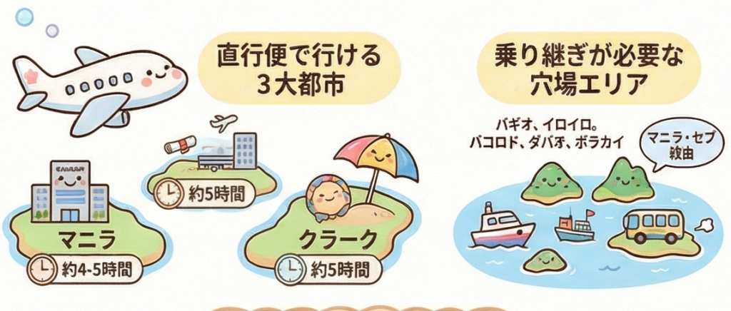 フィリピンの各都市を選ぶ際、見落としがちですが非常に重要なのが「日本からの接近性(アクセス)」です。マニラ、セブ島、クラークの3都市には日本の主要空港から直行便が就航していますが、それ以外の都市は国内線の乗り継ぎや長距離バスでの長時間の移動が必要となります。