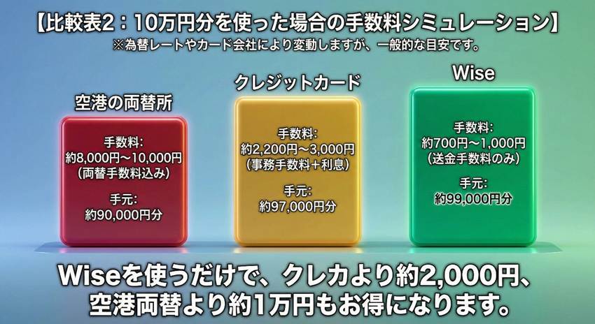 結論:Wiseを使うだけで、クレカより約2,000円、空港両替より約1万円もお得になります。